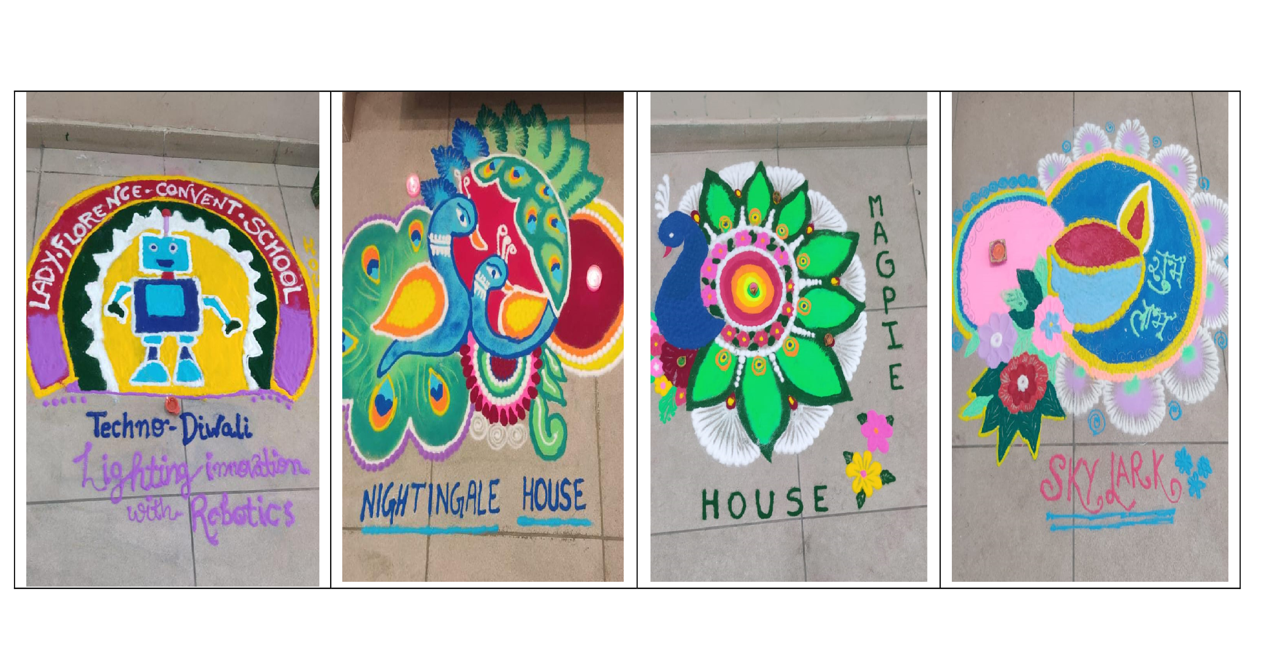 Lady Florence Convent School organized a rangoli competition to showcase the creativity of our students from Grades IX to XII. The corridors of our school were used as a platform by the students to present their creative designs.